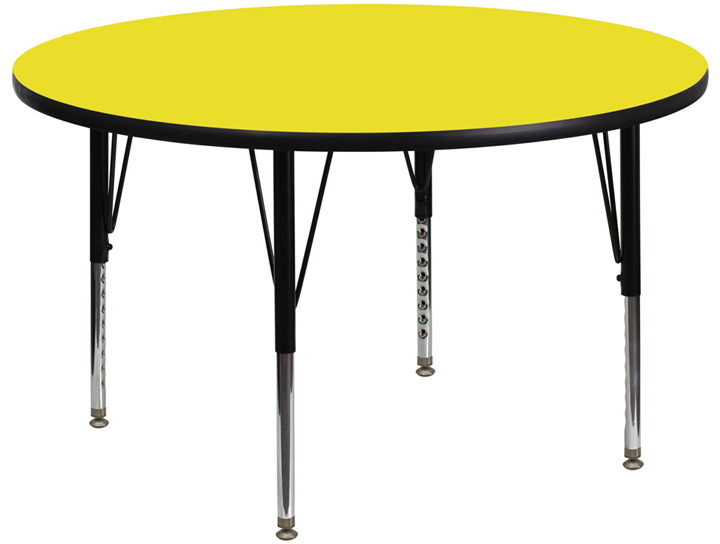 - Flash Furniture's Preschool XU-A48-RND-YEL-H-P-GG warp resistant high pressure laminate round activity table features a 1.25" top and a high pressure laminate work surface. This Round High Pressure Laminate activity table provides an extremely durable (no mar, no burn, no stain) work surface that is versatile enough for everything from computers to projects or group lessons. Sturdy steel legs adjust from 16.25" - 25.25" high and have a brilliant chrome finish. The 1.25" thick particle board top also incorporates a protective underside backing sheet to prevent moisture absorption and warping. T-mold edge banding provides a durable and attractive edging enhancement that is certain to withstand the rigors of any classroom environment. Glides prevent wobbling and will keep your work surface level. This model is featured in a beautiful Yellow finish that will enhance the beauty of any school setting.