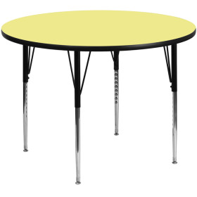 Flash Furniture's XU-A48-RND-YEL-T-A-GG warp resistant thermal fused laminate round activity table features a 1.125" top and a thermal fused laminate work surface. This Round Laminate activity table provides a durable work surface that is versatile enough for everything from computers to projects or group lessons. Sturdy steel legs adjust from 21.125" - 30.125" high and have a brilliant chrome finish. The 1.125" thick particle board top also incorporates a protective underside backing sheet to prevent moisture absorption and warping. T-mold edge banding provides a durable and attractive edging enhancement that is certain to withstand the rigors of any classroom environment. Glides prevent wobbling and will keep your work surface level. This model is featured in a beautiful Yellow finish that will enhance the beauty of any school setting.