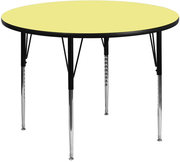 - Flash Furniture's XU-A48-RND-YEL-T-A-GG warp resistant thermal fused laminate round activity table features a 1.125" top and a thermal fused laminate work surface. This Round Laminate activity table provides a durable work surface that is versatile enough for everything from computers to projects or group lessons. Sturdy steel legs adjust from 21.125" - 30.125" high and have a brilliant chrome finish. The 1.125" thick particle board top also incorporates a protective underside backing sheet to prevent moisture absorption and warping. T-mold edge banding provides a durable and attractive edging enhancement that is certain to withstand the rigors of any classroom environment. Glides prevent wobbling and will keep your work surface level. This model is featured in a beautiful Yellow finish that will enhance the beauty of any school setting.