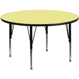 - Flash Furniture's Preschool XU-A48-RND-YEL-T-P-GG warp resistant thermal fused laminate round activity table features a 1.125" top and a thermal fused laminate work surface. This Round Laminate activity table provides a durable work surface that is versatile enough for everything from computers to projects or group lessons. Sturdy steel legs adjust from 16.125" - 25.125" high and have a brilliant chrome finish. The 1.125" thick particle board top also incorporates a protective underside backing sheet to prevent moisture absorption and warping. T-mold edge banding provides a durable and attractive edging enhancement that is certain to withstand the rigors of any classroom environment. Glides prevent wobbling and will keep your work surface level. This model is featured in a beautiful Yellow finish that will enhance the beauty of any school setting.