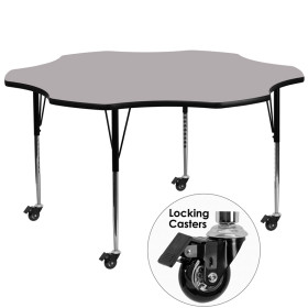- Flash Furniture's XU-A60-FLR-GY-T-A-CAS-GG warp resistant thermal fused laminate flower activity table features a 1.125" top and a thermal fused laminate work surface. This Flower Shaped Laminate activity table provides a durable work surface that is versatile enough for everything from computers to projects or group lessons. This mobile activity table enhances collaborative learning by allowing students to quickly group tables together and lock the wheels for non-movement. Sturdy steel legs adjust from 22.25" - 30.37" high and have a brilliant chrome finish. The 1.125" thick particle board top also incorporates a protective underside backing sheet to prevent moisture absorption and warping. T-mold edge banding provides a durable and attractive edging enhancement that is certain to withstand the rigors of any classroom environment. This model is featured in a beautiful Grey finish that will enhance the beauty of any school setting.
