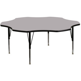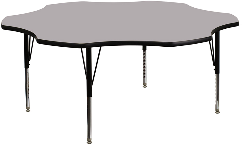 - Flash Furniture's Preschool XU-A60-FLR-GY-T-P-GG warp resistant thermal fused laminate flower activity table features a 1.125" top and a thermal fused laminate work surface. This Flower Shaped Laminate activity table provides a durable work surface that is versatile enough for everything from computers to projects or group lessons. Sturdy steel legs adjust from 16.125" - 25.125" high and have a brilliant chrome finish. The 1.125" thick particle board top also incorporates a protective underside backing sheet to prevent moisture absorption and warping. T-mold edge banding provides a durable and attractive edging enhancement that is certain to withstand the rigors of any classroom environment. Glides prevent wobbling and will keep your work surface level. This model is featured in a beautiful Grey finish that will enhance the beauty of any school setting.