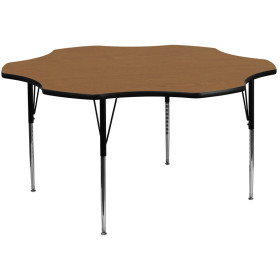 - Flash Furniture's XU-A60-FLR-OAK-T-A-GG warp resistant thermal fused laminate flower activity table features a 1.125" top and a thermal fused laminate work surface. This Flower Shaped Laminate activity table provides a durable work surface that is versatile enough for everything from computers to projects or group lessons. Sturdy steel legs adjust from 21.125" - 30.125" high and have a brilliant chrome finish. The 1.125" thick particle board top also incorporates a protective underside backing sheet to prevent moisture absorption and warping. T-mold edge banding provides a durable and attractive edging enhancement that is certain to withstand the rigors of any classroom environment. Glides prevent wobbling and will keep your work surface level. This model is featured in a beautiful Oak finish that will enhance the beauty of any school setting.