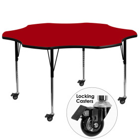 - Flash Furniture's XU-A60-FLR-RED-T-A-CAS-GG warp resistant thermal fused laminate flower activity table features a 1.125" top and a thermal fused laminate work surface. This Flower Shaped Laminate activity table provides a durable work surface that is versatile enough for everything from computers to projects or group lessons. This mobile activity table enhances collaborative learning by allowing students to quickly group tables together and lock the wheels for non-movement. Sturdy steel legs adjust from 22.25" - 30.37" high and have a brilliant chrome finish. The 1.125" thick particle board top also incorporates a protective underside backing sheet to prevent moisture absorption and warping. T-mold edge banding provides a durable and attractive edging enhancement that is certain to withstand the rigors of any classroom environment. This model is featured in a beautiful Red finish that will enhance the beauty of any school setting.