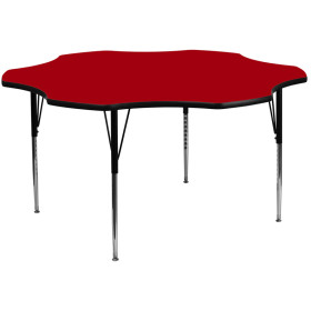 - Flash Furniture's XU-A60-FLR-RED-T-A-GG warp resistant thermal fused laminate flower activity table features a 1.125" top and a thermal fused laminate work surface. This Flower Shaped Laminate activity table provides a durable work surface that is versatile enough for everything from computers to projects or group lessons. Sturdy steel legs adjust from 21.125" - 30.125" high and have a brilliant chrome finish. The 1.125" thick particle board top also incorporates a protective underside backing sheet to prevent moisture absorption and warping. T-mold edge banding provides a durable and attractive edging enhancement that is certain to withstand the rigors of any classroom environment. Glides prevent wobbling and will keep your work surface level. This model is featured in a beautiful Red finish that will enhance the beauty of any school setting.