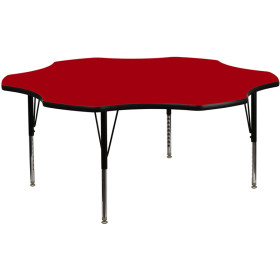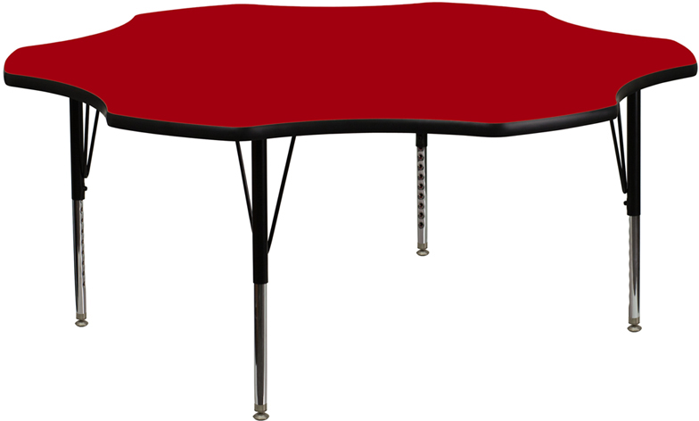 - Flash Furniture's Preschool XU-A60-FLR-RED-T-P-GG warp resistant thermal fused laminate flower activity table features a 1.125" top and a thermal fused laminate work surface. This Flower Shaped Laminate activity table provides a durable work surface that is versatile enough for everything from computers to projects or group lessons. Sturdy steel legs adjust from 16.125" - 25.125" high and have a brilliant chrome finish. The 1.125" thick particle board top also incorporates a protective underside backing sheet to prevent moisture absorption and warping. T-mold edge banding provides a durable and attractive edging enhancement that is certain to withstand the rigors of any classroom environment. Glides prevent wobbling and will keep your work surface level. This model is featured in a beautiful Red finish that will enhance the beauty of any school setting.