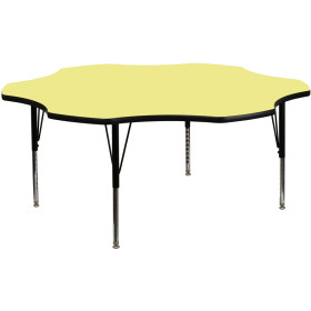 - Flash Furniture's Preschool XU-A60-FLR-YEL-T-P-GG warp resistant thermal fused laminate flower activity table features a 1.125" top and a thermal fused laminate work surface. This Flower Shaped Laminate activity table provides a durable work surface that is versatile enough for everything from computers to projects or group lessons. Sturdy steel legs adjust from 16.125" - 25.125" high and have a brilliant chrome finish. The 1.125" thick particle board top also incorporates a protective underside backing sheet to prevent moisture absorption and warping. T-mold edge banding provides a durable and attractive edging enhancement that is certain to withstand the rigors of any classroom environment. Glides prevent wobbling and will keep your work surface level. This model is featured in a beautiful Yellow finish that will enhance the beauty of any school setting.