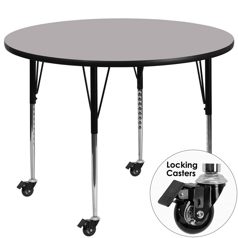 - Flash Furniture's XU-A60-RND-GY-T-A-CAS-GG warp resistant thermal fused laminate round activity table features a 1.125" top and a thermal fused laminate work surface. This Round Laminate activity table provides a durable work surface that is versatile enough for everything from computers to projects or group lessons. This mobile activity table enhances collaborative learning by allowing students to quickly group tables together and lock the wheels for non-movement. Sturdy steel legs adjust from 22.25" - 30.37" high and have a brilliant chrome finish. The 1.125" thick particle board top also incorporates a protective underside backing sheet to prevent moisture absorption and warping. T-mold edge banding provides a durable and attractive edging enhancement that is certain to withstand the rigors of any classroom environment. This model is featured in a beautiful Grey finish that will enhance the beauty of any school setting.