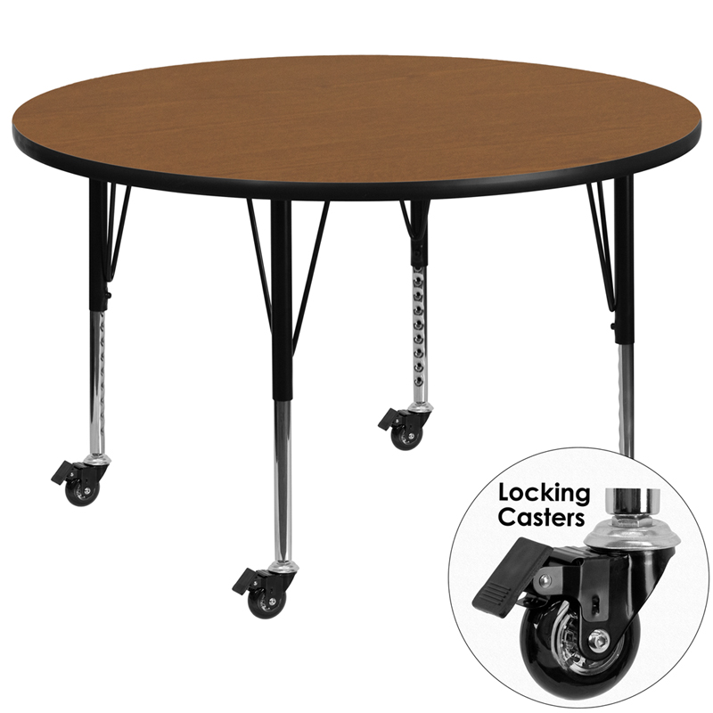 - Flash Furniture's Preschool XU-A60-RND-OAK-T-P-CAS-GG warp resistant thermal fused laminate round activity table features a 1.125" top and a thermal fused laminate work surface. This Round Laminate activity table provides a durable work surface that is versatile enough for everything from computers to projects or group lessons. This mobile activity table enhances collaborative learning by allowing students to quickly group tables together and lock the wheels for non-movement. Sturdy steel legs adjust from 17.37" - 25.37" high and have a brilliant chrome finish. The 1.125" thick particle board top also incorporates a protective underside backing sheet to prevent moisture absorption and warping. T-mold edge banding provides a durable and attractive edging enhancement that is certain to withstand the rigors of any classroom environment. This model is featured in a beautiful Oak finish that will enhance the beauty of any school setting.