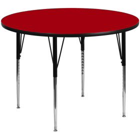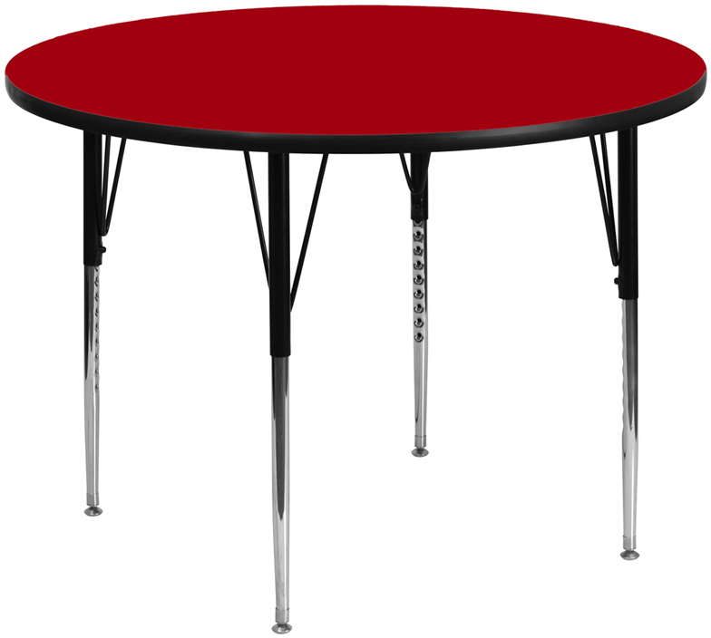 - Flash Furniture's XU-A60-RND-RED-T-A-GG warp resistant thermal fused laminate round activity table features a 1.125" top and a thermal fused laminate work surface. This Round Laminate activity table provides a durable work surface that is versatile enough for everything from computers to projects or group lessons. Sturdy steel legs adjust from 21.125" - 30.125" high and have a brilliant chrome finish. The 1.125" thick particle board top also incorporates a protective underside backing sheet to prevent moisture absorption and warping. T-mold edge banding provides a durable and attractive edging enhancement that is certain to withstand the rigors of any classroom environment. Glides prevent wobbling and will keep your work surface level. This model is featured in a beautiful Red finish that will enhance the beauty of any school setting.
