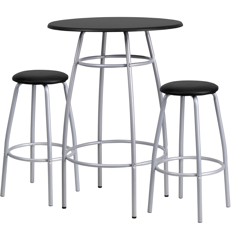 - This attractive table set includes two backless barstools and a bar height table. The contemporary style set includes silver powder coated bowed out frames and black vinyl padded seats. This multi-use set can accent the dining area, bar area or game area.