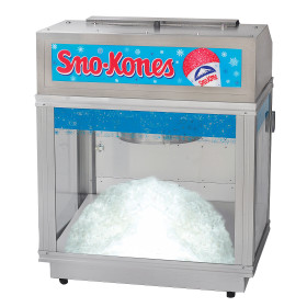The Shavatron has a quiet geared belt drive system and "Power Wedge" automatic feed system with a safety inter-lock for the operator protection. Three large blades in the shaver head turning at just over 300 RPM enable you to plane snow off the ice cubes or chunks in the hopper. This high output snow cone machine is very easy to use and maintain. Powered by 1/2 HP motor with silent cog-belt drive, no gears to wear out.