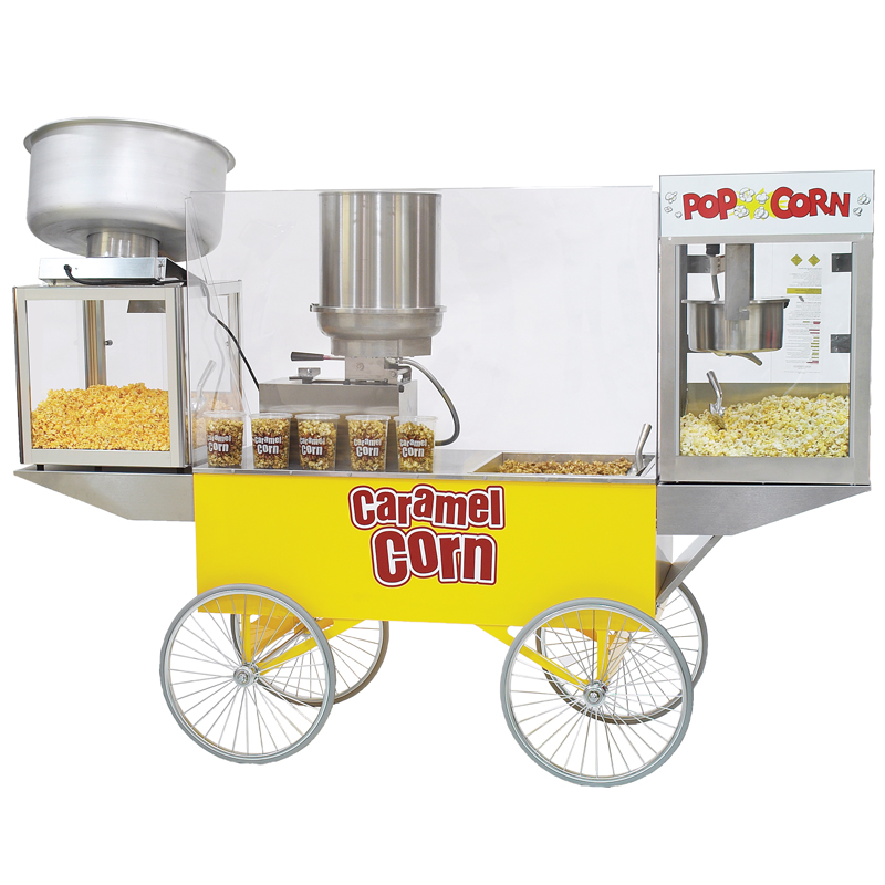 Included on the Mini Three-in-One Lobby Master are the Combo 2 in 1 Kandy King Left Hand Dump and a built-in Karamel Kool system. It also includes a Pop Maxx 12/14-ounce popper with the Unimaxx system that uses less electricity, and has a durable, easy-to-clean stainless steel kettle. The third item is the Cheddar Easy Shop Combo Mixer/Display. The cart has stainless steel counter, yellow painted exterior, 4 spoke wheels.