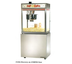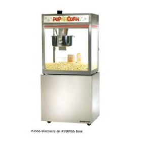 The Discovery Popcorn Machine Popper features the Pop-O-Gold kettle in a Value Line cabinet. The all welded stainless steel upper cabinet provides strength on this popcorn machine. Comes already wired for an optional oil delivery system. This model is designed for the back counter with the lighted sign on the operators side. Also features E-Z Kleen kettle with twin arm suspension, all welded stainless steel upper cabinet, 3 stage exhaust filter system, removable glass, lighted sign and "Big Eye" Heat Control system which eliminates thermostat problems and provides the operator with both a visual light and a buzzer to alert you when it is time to dump the kettle. Included Stainless Steel floor base.