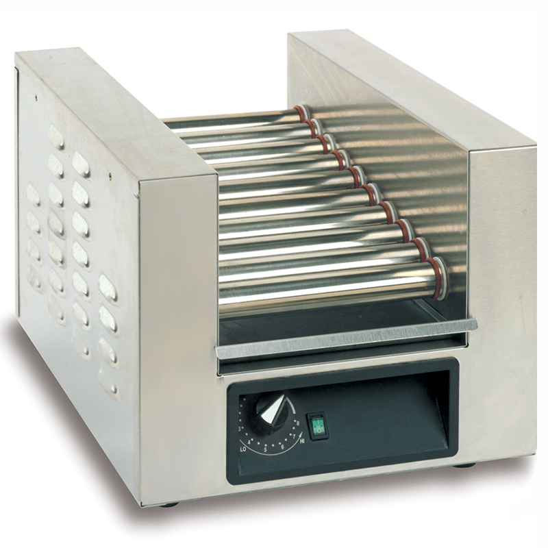 Squeeze this mini model into any space - bars, multi-snack stands, pool areas and more - what better way to maximize 13" of counter space? The 10 stainless steel rollers efficiently cook up around three cycles of single-row dogs per hour.