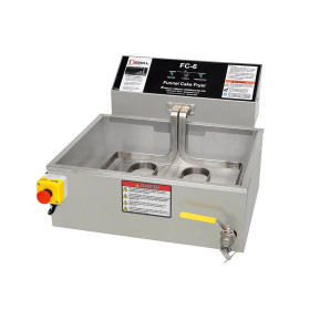 Take this ace for a spin. The Deluxe Hot Shot Fryer FC-4 takes it up a notch with a 6,600-watt fryer. Talk about hot shot, it features a full 47 lb. oil capacity, oil pre-heat function, quick oil recovery time, emergency stop/power off button and safety drain plug and ribbon heat element with digital heat control. This is the perfect funnel cake fryer for high volume locations such as amusement parks, stadiums and more.
