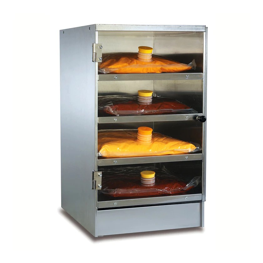 - Includes door and four heated shelves sized for one standard size of cheese or chili bag