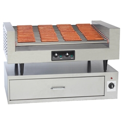 This stainless steel bun warmer holds and warms 36 hot dog buns and fits under a roller grill GM-8225 for maximum use of space. Shown with GM-8225 grill not included.