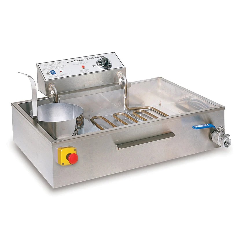 K-6 Funnel Cake Fryer (27-3/8"W x 17-1/2"D x 10"H) easily produces approximately 90 average size 8" Funnel Cakes per hour. This higher capacity shallow fryer will easily do six Funnel Cakes at a time and keep up with virtually a continuous “pour and cook both sides” from a single fryer. With the proper tools, two K-6 Shallow Fryers could produce between 180 and 240 average Funnel Cakes per hour! At $2.00 to $3.00 each, depending upon the toppings, it's easy to see how quickly these units will pay for themselves! Drain board is furnished primarily to keep under the counter and "cover" the fryer at night or in case of an emergency, such as a fire.