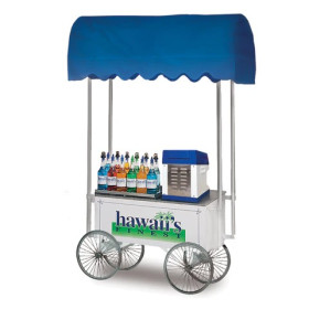 All eyes will be on you with this wagon! Load the Hawaii's Finest Shave Ice Wagon #2936HF with your favorite flavors and right-sized shaver. Featuring vivid graphics, white powder-coated stainless steel base and stainless counter, this wagon is not only attention-grabbing but durable. Make sure to add this mobile setup to arenas, tourist attractions and more! Wheels roll but are not steerable. All items sold separately.