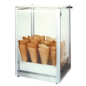 With the Gold Medal giant waffle cone display case, you can encourage impulse buying of all the delicious ice cream flavors that your ice cream parlor or restaurant has to offer! This commercial display case is specifically designed to showcase delicious waffle cones, has a Lexan top and a removable door for ease in loading/unloading and also in cleaning up. The display case is constructed from both stainless steel and aluminum with glass sides for optimal visual display with strength for long lasting service. Display Case, giant waffle cone, plexiglas windows, lexan top, removable door, stainless steel & aluminum construction. Cones are put in our #8215 Giant Cone Counter Trays. (Order separately and put in cabinet for display)