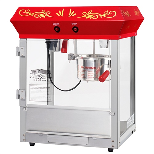If you are in the market for a popcorn popper, stop looking! These Great Northern Popcorn top quality machines feature stainless steel food-zones, easy cleaning stainless steel kettles, old-maid drawers (for unpopped kernels), tempered safety glass panels and an industry leading 6 ounce kettle. The antique style design evokes memories of early days at the ball games, carnivals, or the movie theater. We have combined the best of both worlds - not only are you getting today's technology, you get an authentic design with all the conveniences of the modern era.We have sold thousands of these units to churches, schools, businesses, day care centers, varsity/PTA clubs, and more. Of course, our #1 customer is the home owner looking to add a theatrical effect to their home theater. BONUS! We include FREE 3 plastic serving cups, 25 popcorn serving bags, measuring cups and a popcorn scoop with every popper!