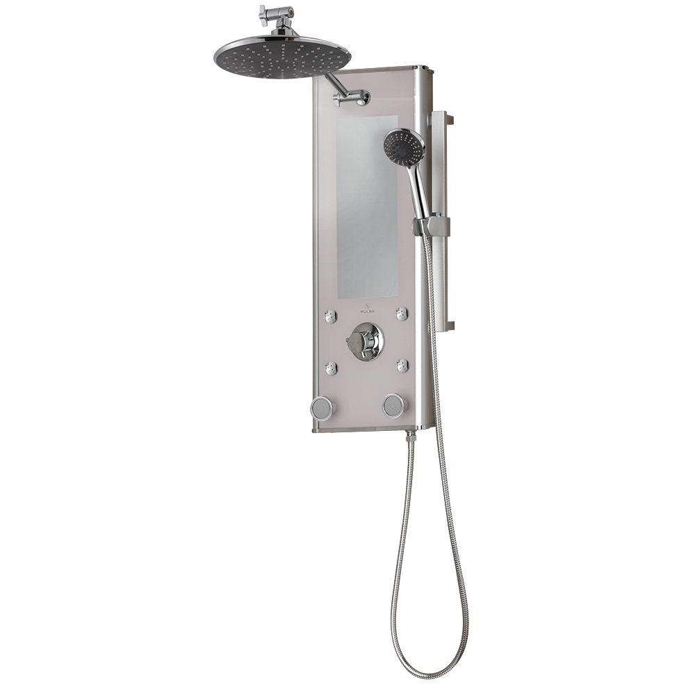 Transform your shower experience into a peaceful utopia with the beautiful Shangri-La ShowerSpa! This ShowerSpa comes equipped with an 8 inch soothing rainshower, two Silk-Spray™ body jets, four rejuvinating facial misting jets, a multi-function hand shower with adjustable slide bar, and built in mirror. This ShowerSpa simply connects to the existing shower head outlet and secures with a versatile mounting system. Designed to utilize your pre-existing (hot/ cold) mixing valve, the Shangri-La easily transforms your shower into an oasis within an hour.