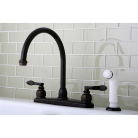 The Nuwave French faucet captivates with its soft curves and contemporary European elegance. The kitchen faucet features a double handle setup and an 8" centerset platform. The body is fabricated from solid brass for durability and long-lasting use. The color finish is made of oil rubbed bronze for resisting scratches, corrosion and tarnishing. The spout rotates 360 degrees for accessibility and convenience. The handles function with a 1/4-turn rotation to control the water's volume. The faucet also operates with the use of a washerless cartridge for drip-free functionality; with a 2.2 GPM (8.3 LPM) and a 60 PSI maximum rate. An integrated removable aerator is inserted beneath the spout's head piece for conserving water flow. A 10-year limited warranty is provided to the original consumer.