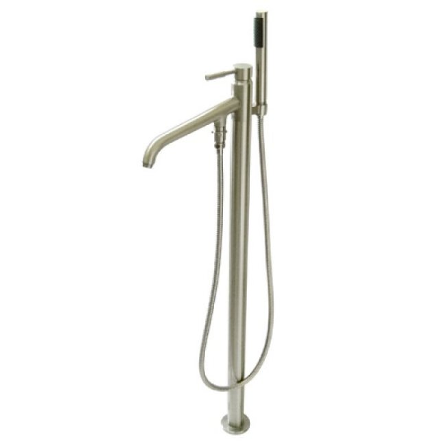 The Concord Pillar Roman Tub Filler features a slanted smooth surfaced spout attached to a 59" hose which connects to a hand shower mounted in the rear of a 37-13/16" vertical stand. The tubular handle lever above the spout controls water flow for both hot and cold temperatures. Adopted from the contemporary modern design, the filler is constructed in high quality brass for durability and long-lasting use.