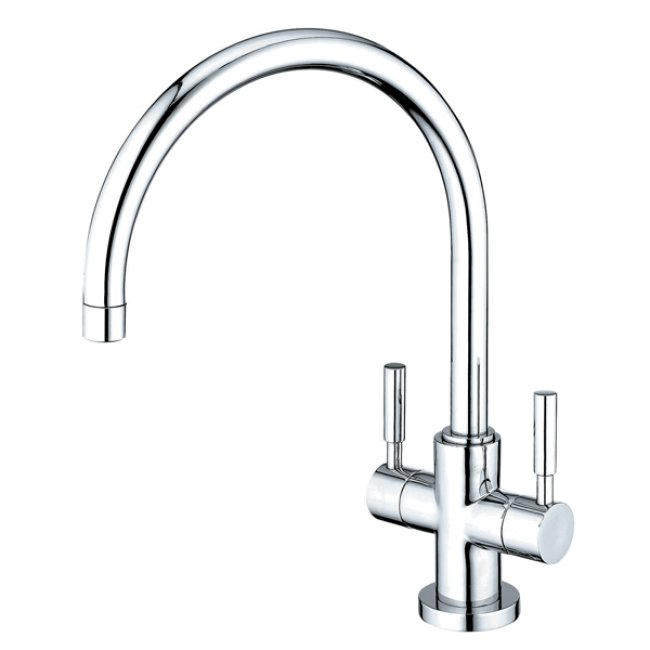 This double handle kitchen faucet is made from a vibrant polished chrome finish and features two hand levers diagonally mounted on the lower neck of the spout. The long goose neck spout has an 8-1/2" reach for convenient access to washing your kitchen appliances and is made from solid brass for durability and reliability.