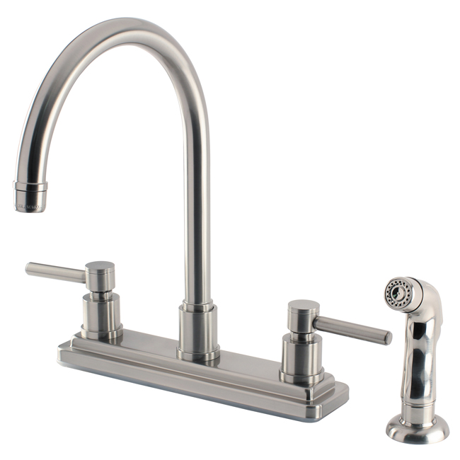 Add beauty and function to your kitchen with the Concord Kitchen Faucet with Side Sprayer. This faucet features bold lines and solid brass construction for durability and reliability. The spout reaches out 8" and swivels for easy cleaning. The faucet includes a matching side sprayer and the faucet installs on standard US plumbing connections.