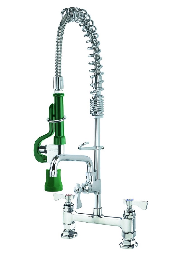 Krowne Royal Series Space Saver Pre-Rinse Assembly with Add-On Faucet with 6" Spout, Deck Mounted, 8" Centers, Spring Action Flexible Gooseneck, 24-1/2" High w/ 8" Overhang, 15" Hose, 11" Riser, 1/2" NPT Female Inlets, NSF, CSA, Low Lead Compliant