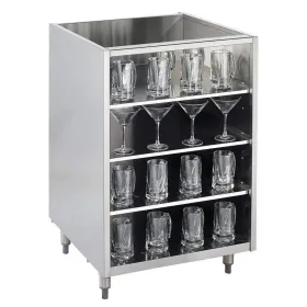 Measuring 18" wide by 24"deep by 35"high, the Krowne KR-G18 underbar glass storage cabinet provides a compact solution for storing glassware on the back-bar wall. Designed without a top, it integrates beneath existing bar structures, and its three shelves offer organized storage. The stainless steel interior and exterior sides enhance durability, and the galvanized steel back provides structural support.