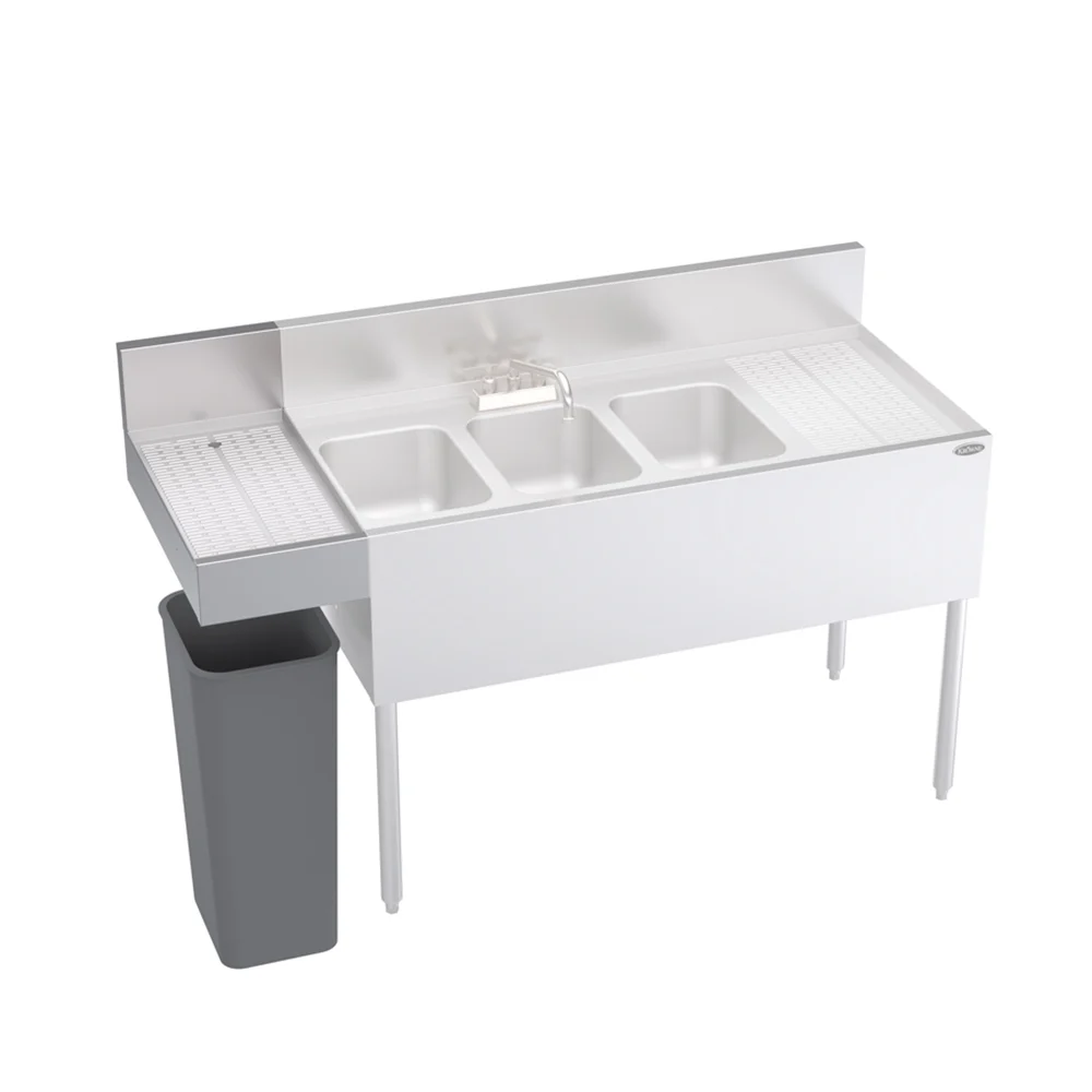 The Krowne KR-TC Royal 18 underbar modification features an apron cutout designed to accommodate a trash can beneath the drainboard. Compatible with drainboards measuring at least 12 inches, it fits receptacles up to 25 inches high, creating a streamlined waste disposal solution for bar setups.