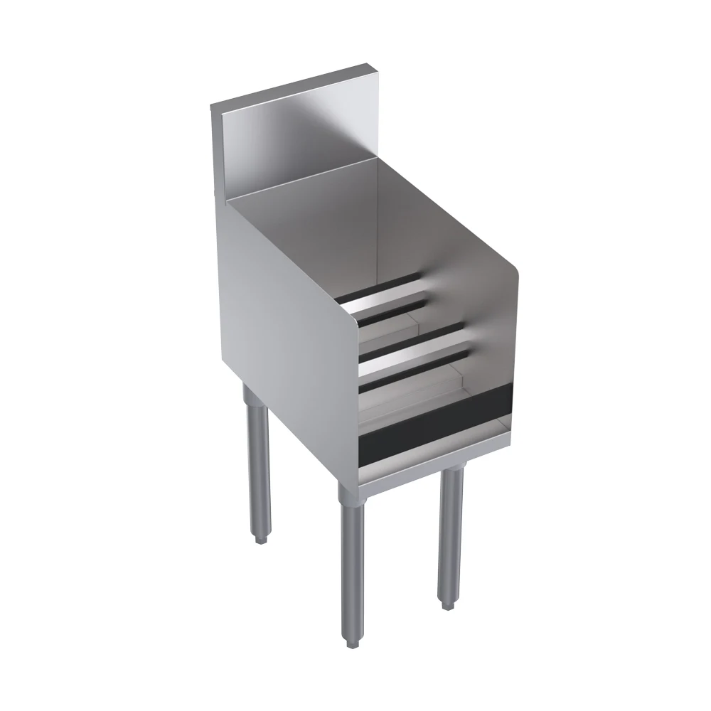 Measuring 12" wide by 19" deep by 36.5" high, the Krowne KR19-12RD Royal underbar liquor bottle display holds up to nine bottles on three-tiered steps, ensuring quick and easy access for bartenders. Each step is equipped with guard rails to keep bottles secure. Built for durability, the display features a stainless steel top, front, and sides, while the stainless steel legs with adjustable thermoplastic bullet feet provide stability on various surfaces. Its compact design helps maximize underbar space while maintaining an organized presentation.