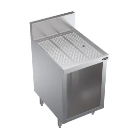 The Krowne KR24-S18 Royal 1800 series underbar glass storage unit keeps glasses within convenient reach for restaurant staff. It has a storage base with an open front so bartenders can quickly reach inside. To promote drying, the top is an embossed drainboard, while its 7" backsplash keeps messes contained. Because it's made of stainless steel, the unit will hold up against the scratching and denting of a busy bar.