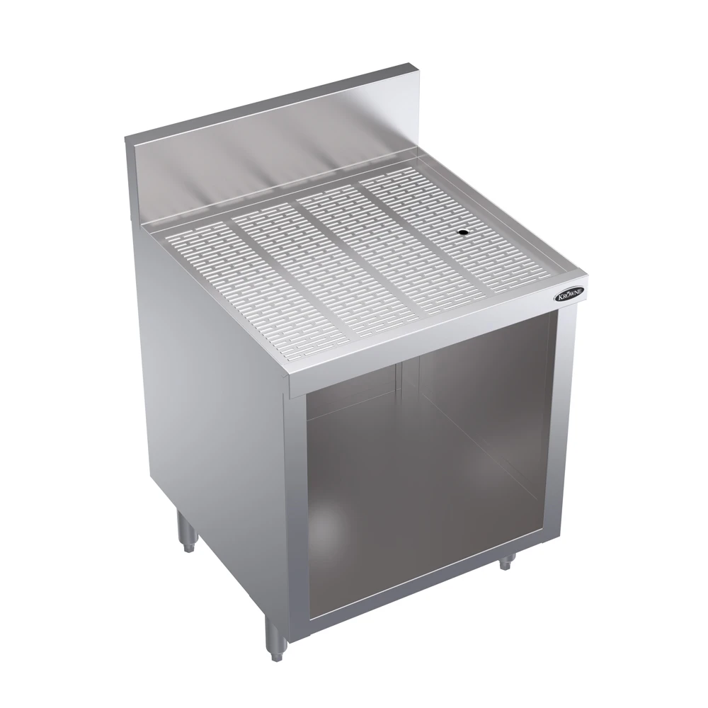 The Krowne KR24-S24 Royal underbar drainboard with an open cabinet base provides an efficient solution for draining and storing glassware in bar setups. Measuring 24"wide and 24"deep, this unit features an embossed stainless steel drainboard top that promotes proper water runoff, keeping bar tools and glassware dry. The open-front cabinet base allows easy access to storage, enhancing convenience during busy service hours. Constructed with a stainless steel top, front, and sides, it offers durability and corrosion resistance for long-term use.