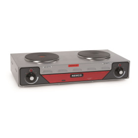 Powerful NEMCO burners make an attractive choice for demonstration cooking. Solid-top, cast-iron French burners heat up quickly and evenly, with six heat settings that can take you from a simmer to a boil in minutes. Horizontal and vertical configurations with one-, two- and four-burner setups fit most spaces. Multiple burners offer heating versatility. Right burner on the horizontal is a 1500-watt cooker, while the 500-watt left burner is perfect for warming. Vertical units have the cooker in the front. Durable, stainless steel construction makes cleanup quick and easy. All models equipped with adjustable feet for added convenience.