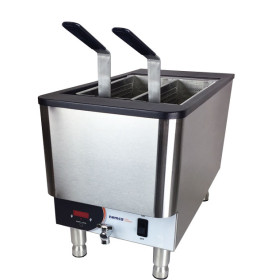 Built for speed and built to last, this boiler preheats in 12 minutes and recovers extremely quickly. Stainless-steel construction with a powder-coat top and durable-alloy twin baskets with insulated grips enhance performance life. Smaller accessory baskets give you the quickserve ability to cook and drain up to six individual orders at once. A digital thermostat—with a temperature range of 100° F to 212° F—and programmable timing provide versatile cooking control. A turn-knob drain mechanism makes cleaning easy.