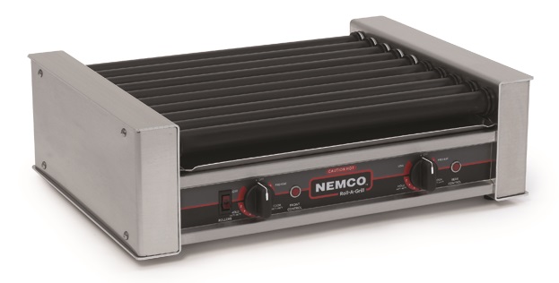 Let profits roll! Everybody loves a NEMCO Roller Grill hot dog. Plus, these surprisingly versatile machines are also great for such ethnic favorites as egg rolls and tamales. The 360° roller rotation prevents residue buildup, while individual roller heating elements ensure heating consistency. Removable drip pan makes for easy cleaning. Electric power requires no ventilation system. Seven heat settings offer convenient temperature control. For optimum roller performance capability, look for GripsIt models that include SilverStone with grip-and abrasion-resistant additive.