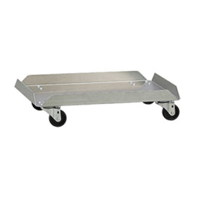 APPLICATION: One - piece aluminum sheet design with open corners for easy cleaning. Two - inch (2”) sides bent upward to contain product. Chicken case dolly has three sides up and one side down for easy loading and unloading of product. Casters are 3” x 1 - 1/4” polyolefin swivel wheels. Dolly with Handle must be ordered at the time of fabrication.