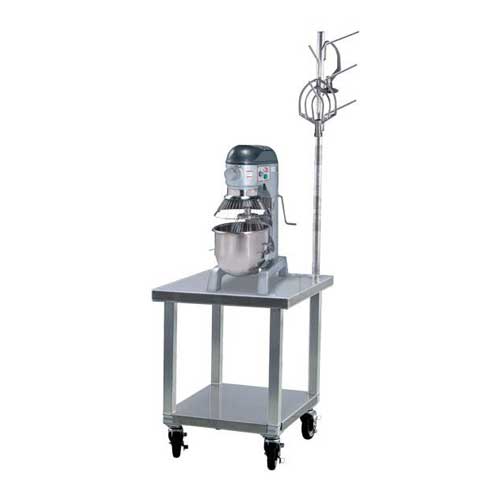 APPLICATION: This mixer stand has a two tier design with stainless steel shelves. The removable accessory tree has five 3/8” diameter rod hangers for various utensils.