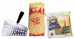 Everything you need to get popping! Each kit has a case of portion packs, 1,000 popcorn bags and a metal scoop.