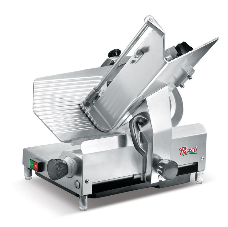 Primo PS-12D anodized aluminum meat slicer has a 12" diameter blade powered by an electric motor for slicing meats with an adjustable cut thickness from 0 to 10 mm, a removable slicing carriage, and a built-in sharpener and ring guard for safety. This meat slicer is made of anodized aluminum for corrosion resistance. The slicing carriage can accommodate meat pieces up to 8 x 7.5 inches, and is removable for cleaning and maintenance. It has a built-in blade sharpener and a ring guard for safety. The slicer has permanently lubricated carriage ball bearings for quiet operation. The motor is rated for 120 volts and 60 hertz for use with single-phase power in North America, and has an automatically resetting thermal protector to help reduce the need for parts replacement in case of overheating. This slicer is not designed for cheese slicing applications.