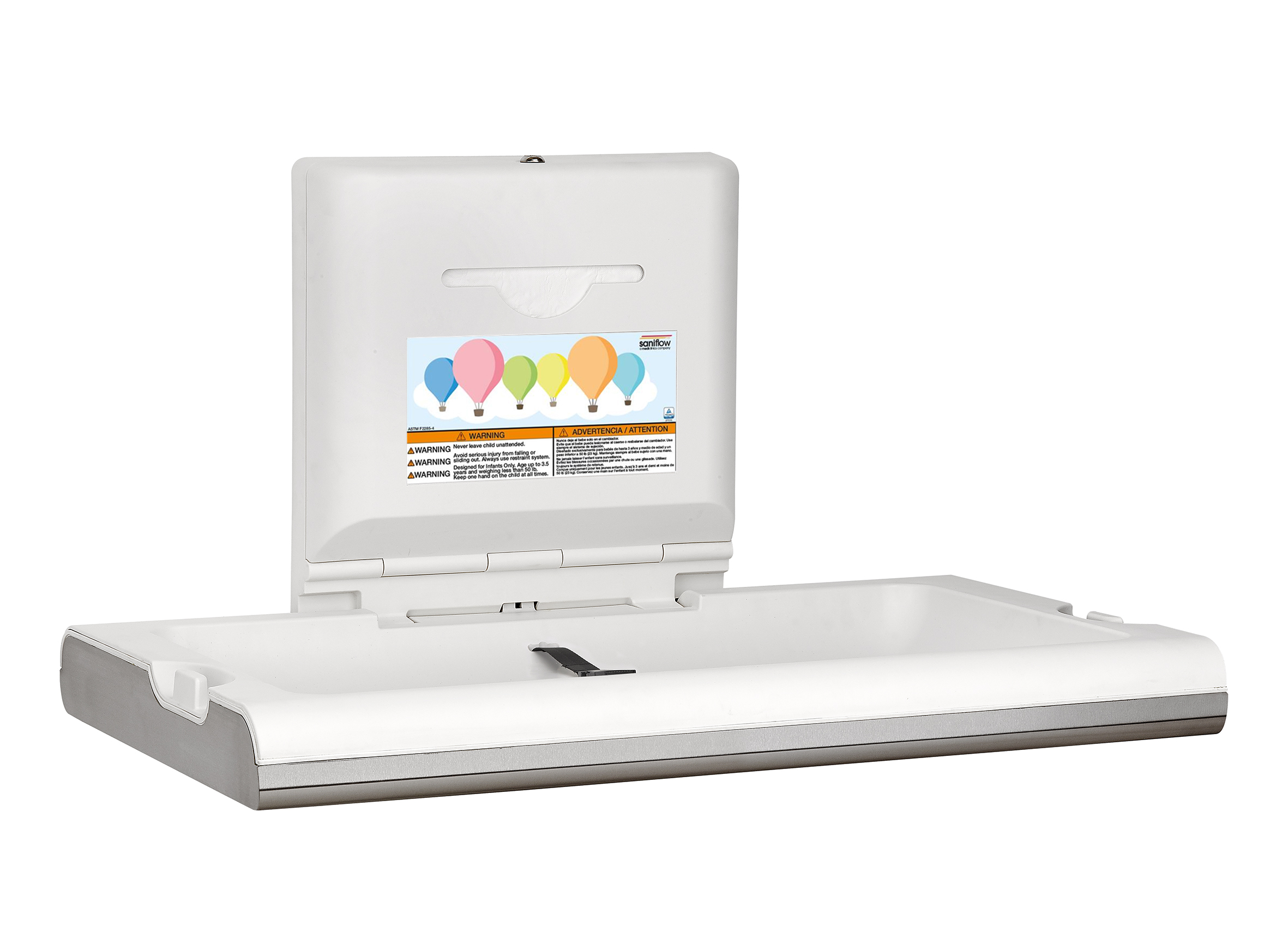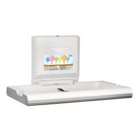 Horizontal surface-mounted baby changing station made of bacterial-resistant polypropylene and with Ion Hygienic Technology that actively disinfects the baby changing table.