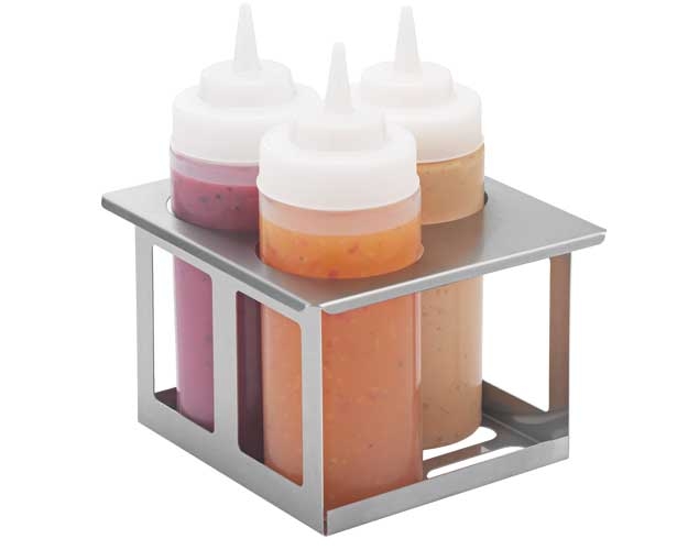 Make sandwich dressing convenient and efficient with a Squeeze Bottle Holder. Designed for use in a cold table, the holder takes up the same space as a 1/6-size steam table pan.