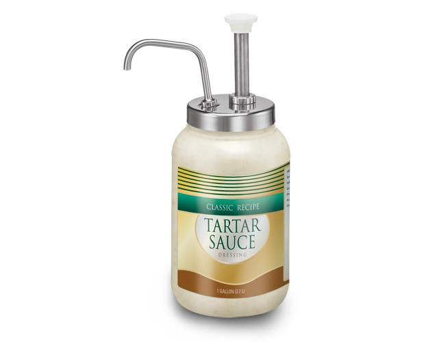 This stainless steel condiment pump is ideal for dispensing just about any condiment or dressing, including those with larger chunks such as tartar sauce and Thousand Island dressing directly from a plastic or glass gallon (3.8 L) jar with a 110mm opening. Black lid is constructed of polycarbonate.