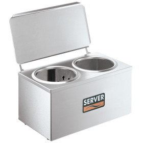 The Double Dip Server accepts two stainless steel jars or #10 cans of dip coat. However, your local jurisdiction may not permit dispensing directly from a #10 can. We recommend dipping from our NSF approved stainless steel jar #94009 (see comparison product below).
