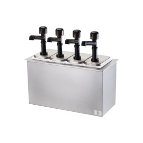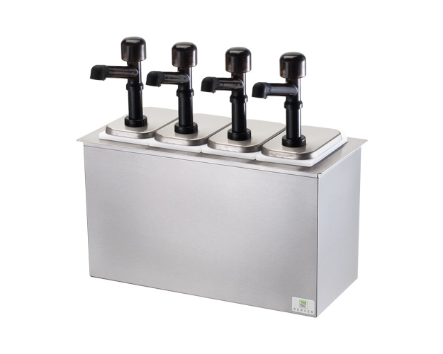 This drop-in insulated bar combo includes two Solution pumps 81910 and deep plastic fountain jars 82557. The brushed finish base reduces the visibility of fingerprints and may be cooled with (2) Eutectic Ice Packs, HOLDCOLD Jars or ice. Ice packs and HOLDCOLD jars are sold separately.