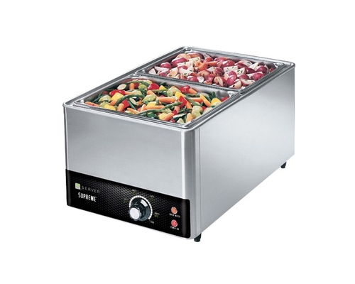 This full-size pan warmer is all stainless steel, including the water vessel. It features an adjustable real thermostat with degree markings and a water bath design. The adjustable thermostat actually senses food temperature and turns the heating element to on or off to keep your product at the perfect temperature. The FS-20SS is end operated for adjustment ease when lining up more than one warmer.
